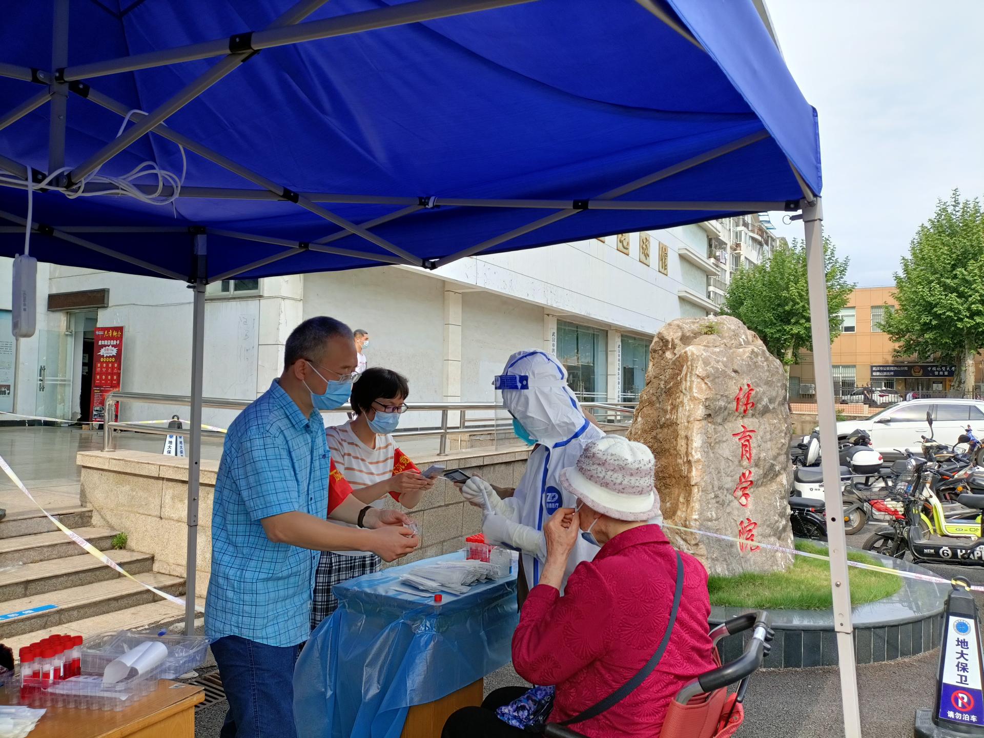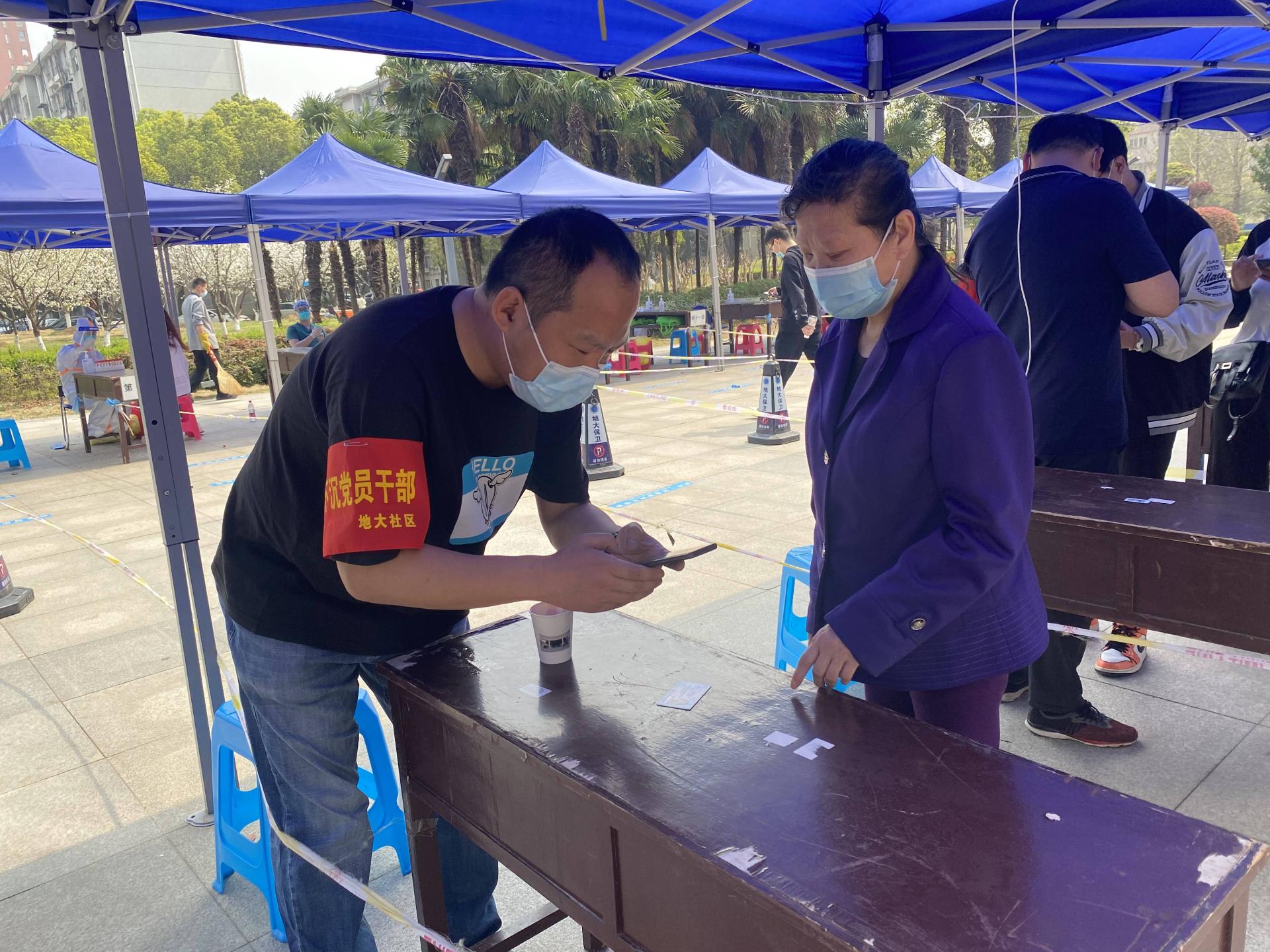 师学明老师(右一)在核酸检测现场志愿服务