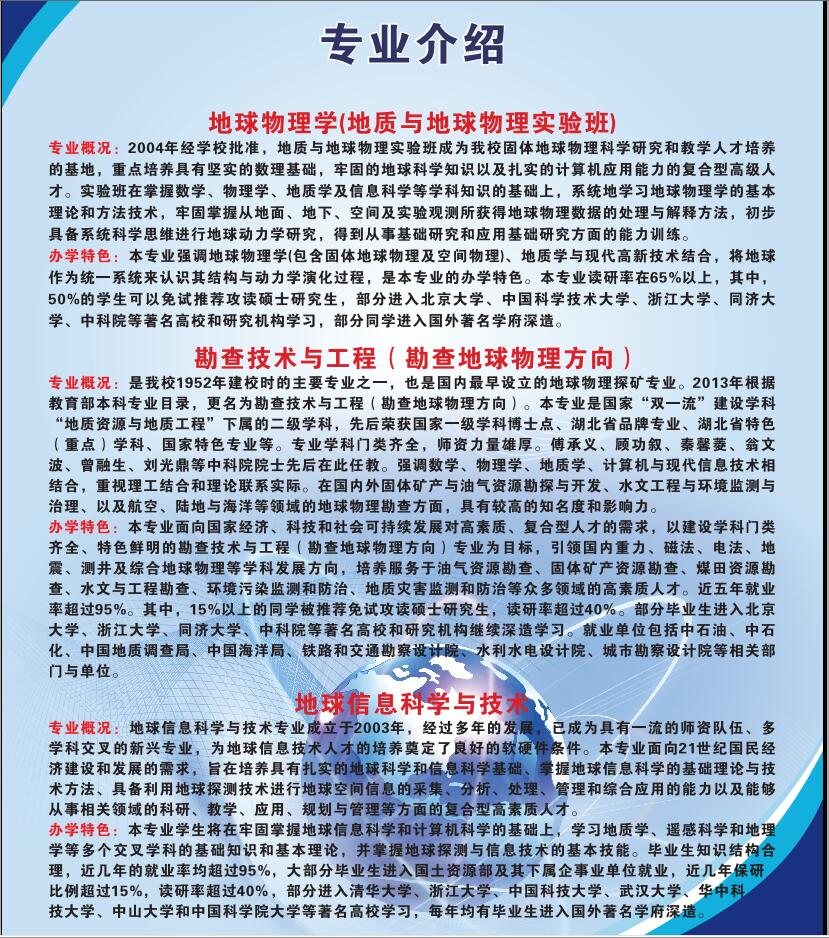 伟德国际VICTOR1946现有三个专业:地球物理学、勘查技术与工程、地球信息科学与技术。其中勘查技术与工程专业于2019年6月通过中国工程教育专业认证,