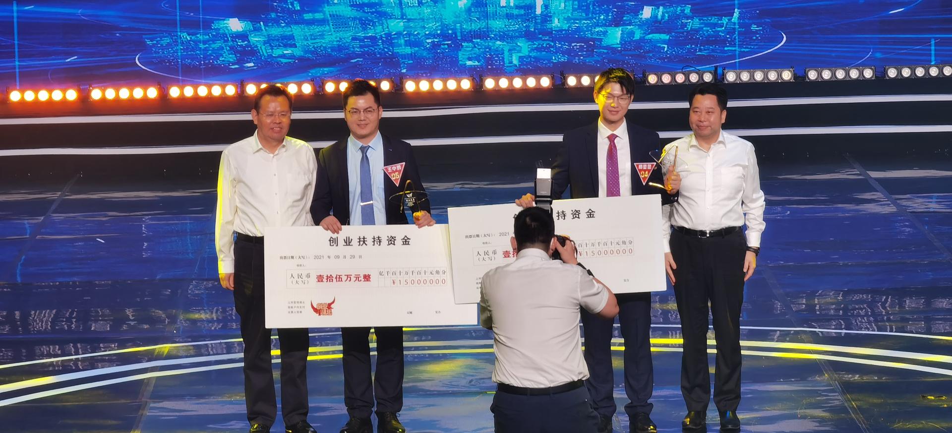 武汉市市长程用文为四强选手、“创业之星”获得者、公司在读博士生王中鹏颁奖。董事长王焰新院士通过现场视频为创业老员工发来寄语,希望广大老员工扎根荆楚大地,锤炼创的精神、创的劲头。