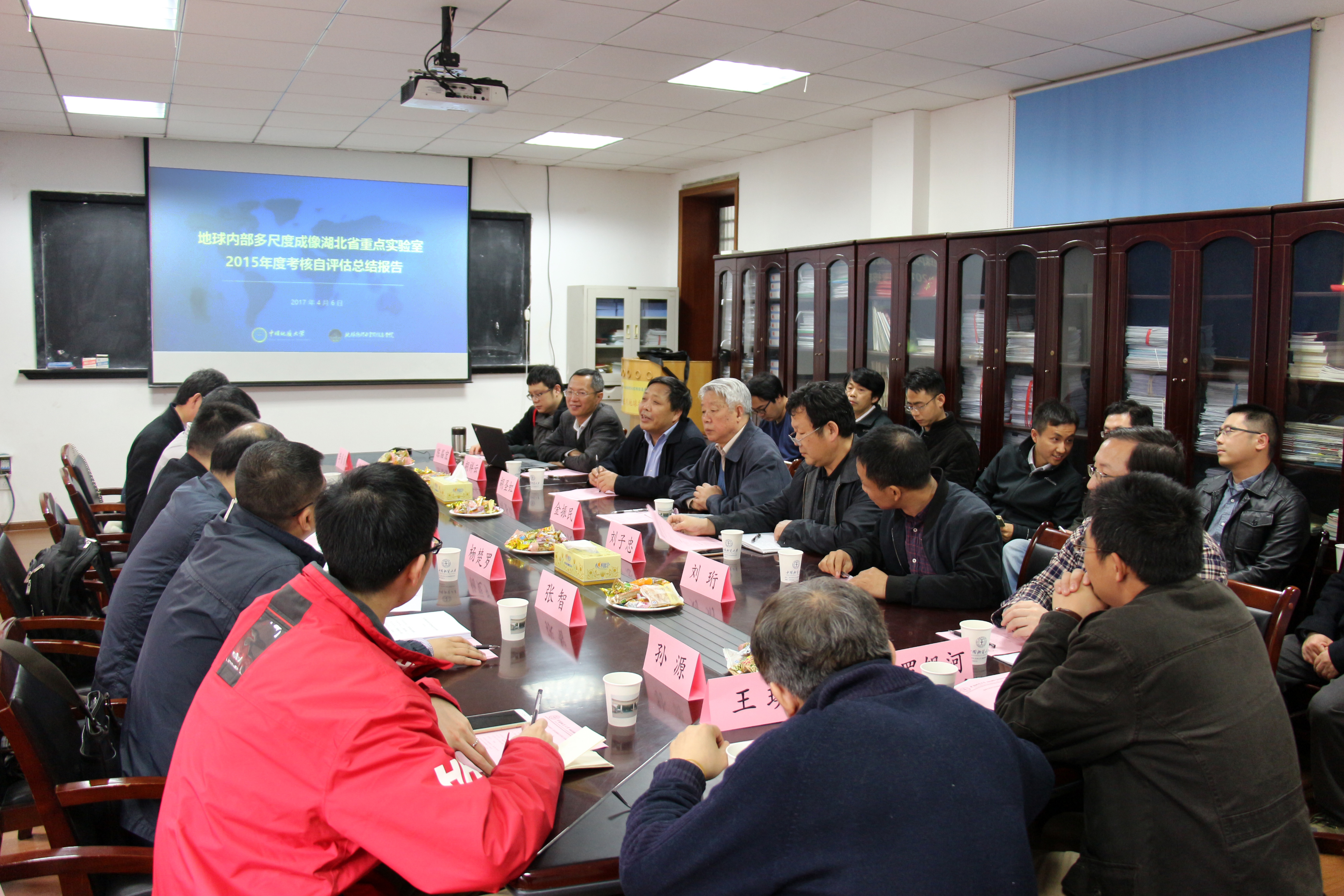 现场评估专家组组长谭必恩教授主持了会议,胡祥云教授代表“地球内部多尺度成像湖北省重点实验室”做了年度考核现场汇报,从实验室基本概况、人才队伍建设、基础设施建设、2015年科研产出、实验室运行体制及中长期规划等方面做了详细汇报,专家组根据汇报内容进行了提问交流、现场考察。